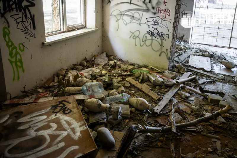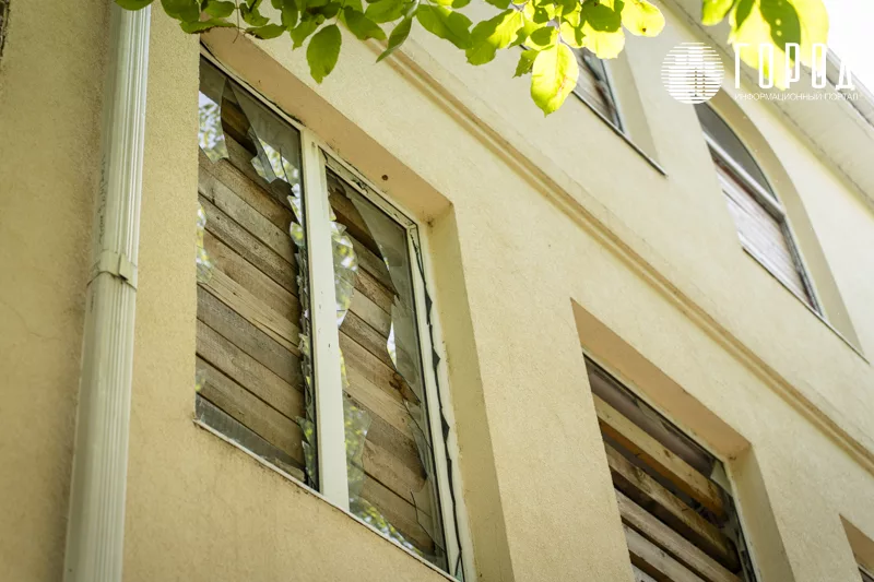 Качественная лестница ведёт на террасу и к главному входу. Окна повсюду выбиты. На всех этажах кучи мусора. В основном – пустые бутылки, старые вещи и строительный мусор.