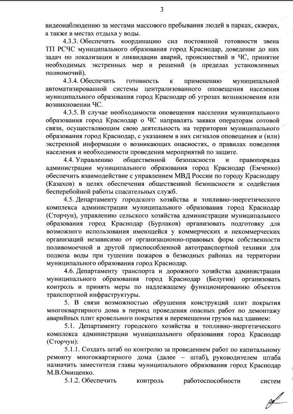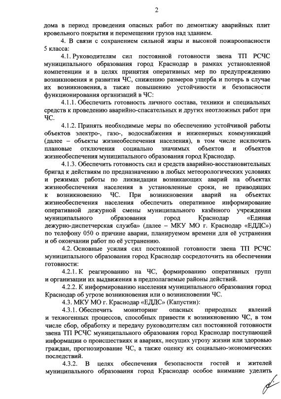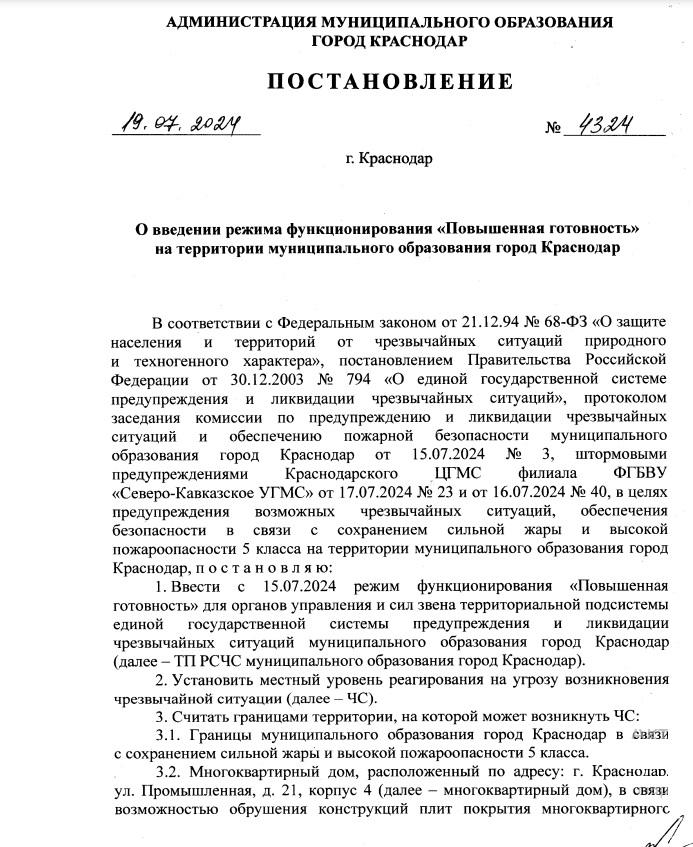К 24 июля глава Краснодара Евгений Наумов подписал постановление о введении на территории города режима повышенной готовности из-за аварийного многоквартирного дома на улице Промышленной, 24/1 и аномальной жары.