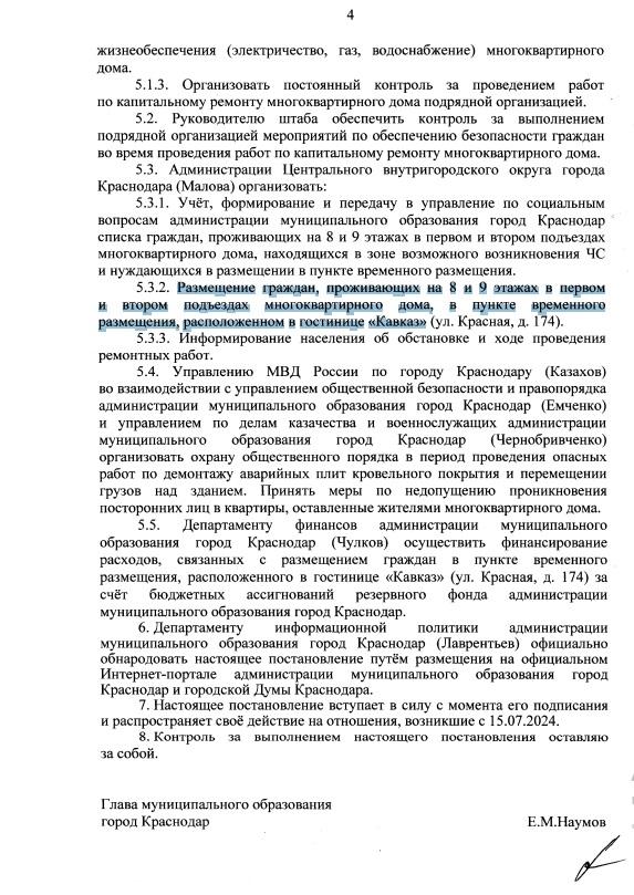 Мэр распорядился обеспечить размещение жильцов 8 и 9 этажей первого и второго подъездов девятиэтажки в пункте временного размещения, созданного на базе гостиницы «Кавказ». Проживание оплатят за счёт городского бюджета.